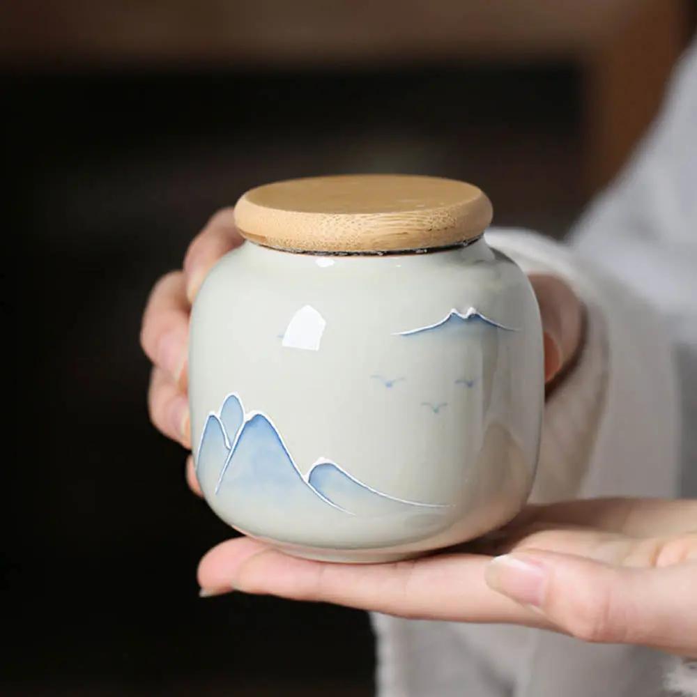 Conservez vos feuilles de thé dans une atmosphère d’harmonie et de sérénité avec cette superbe boîte à thé en céramique. Son design épuré, orné d’un délicat motif de montagnes peintes à la main, évoque la quiétude des paysages asiatiques. Compacte et élégante, elle peut contenir jusqu’à 50g de thé en vrac, idéale pour préserver vos thés préférés dans des conditions optimales.
