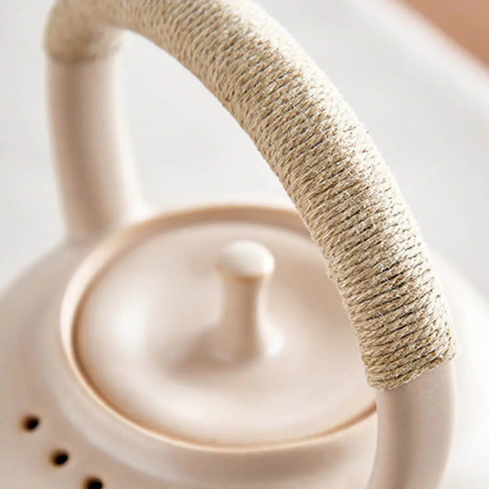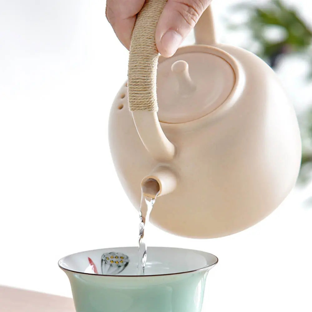 Épurée, douce et pleine de caractère : cette théière céramique au style chinois est un vrai coup de cœur. Avec sa contenance généreuse de 750 ml et son anse recouverte de corde naturelle, elle allie design fonctionnel et confort d’usage. Grâce au filtre intégré directement moulé à l’intérieur, vos feuilles restent bien en place, et le service se fait avec précision et fluidité.